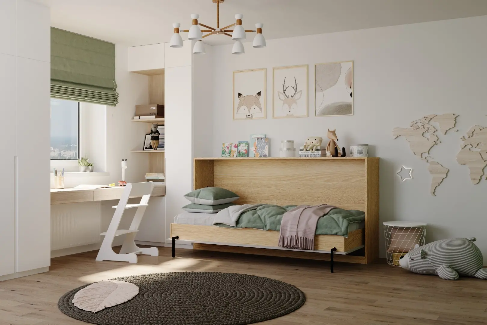 Детская горизонтальная шкаф-кровать "Little sleeper".  Работает на механизме раскладывания собственной разработки "Start". Кровать раскладывается легким движением руки, превращаясь в полноценное спальное место. Просто потяните ее за ручки, расположенные на фасаде и выставите ножки-опоры.